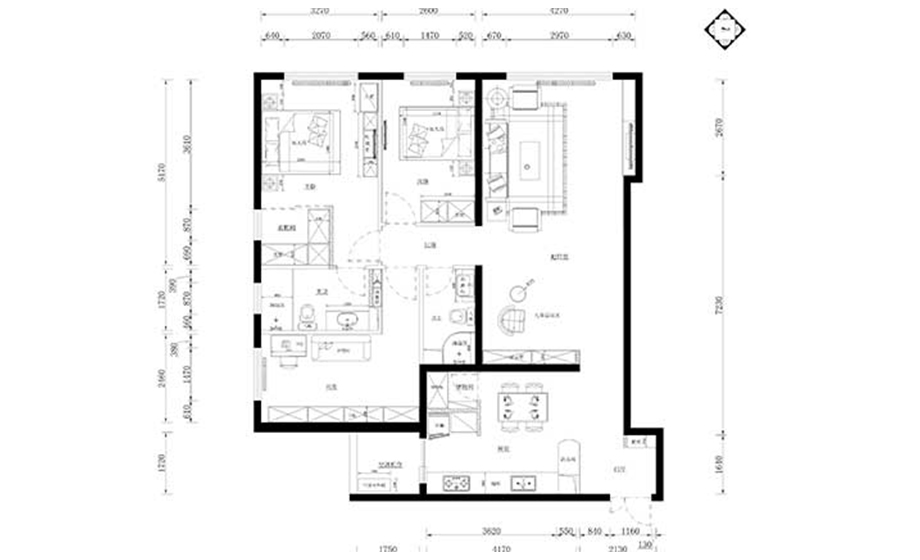 此戶型為三口之家,兩位老人帶孩子,風格定義為現代風格。需要有孩子的活動玩耍空間,所以把起居室分割為會客廳及活動區,而原有就餐區移到原廚房,做一開放式廚房餐廳于一體,獨立的門廳部位,這樣可以更好的區規劃。