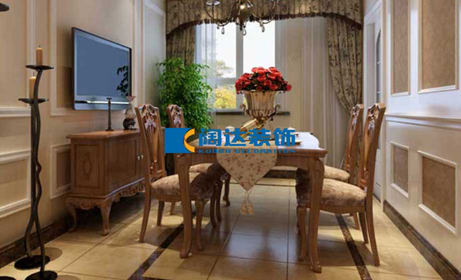 餐廳:餐廳的背景墻與沙發背景墻形成呼應的狀態,使房屋效果更加整體。地面也做了功能區域區分,不會讓人產生區域錯覺。
