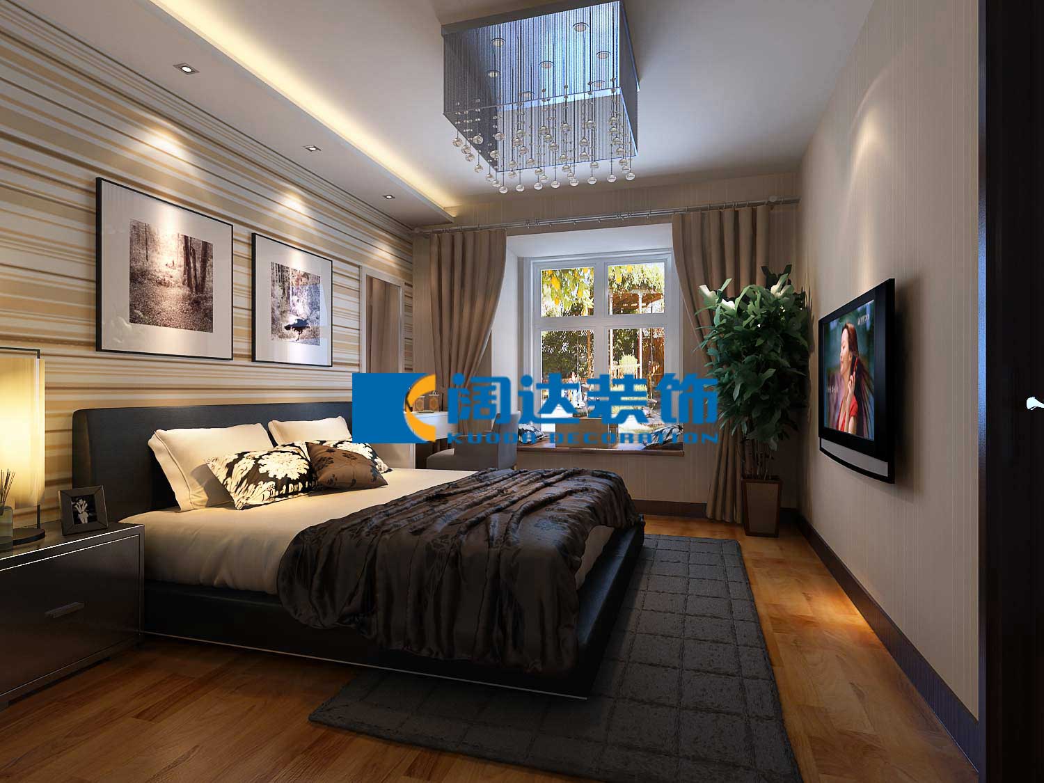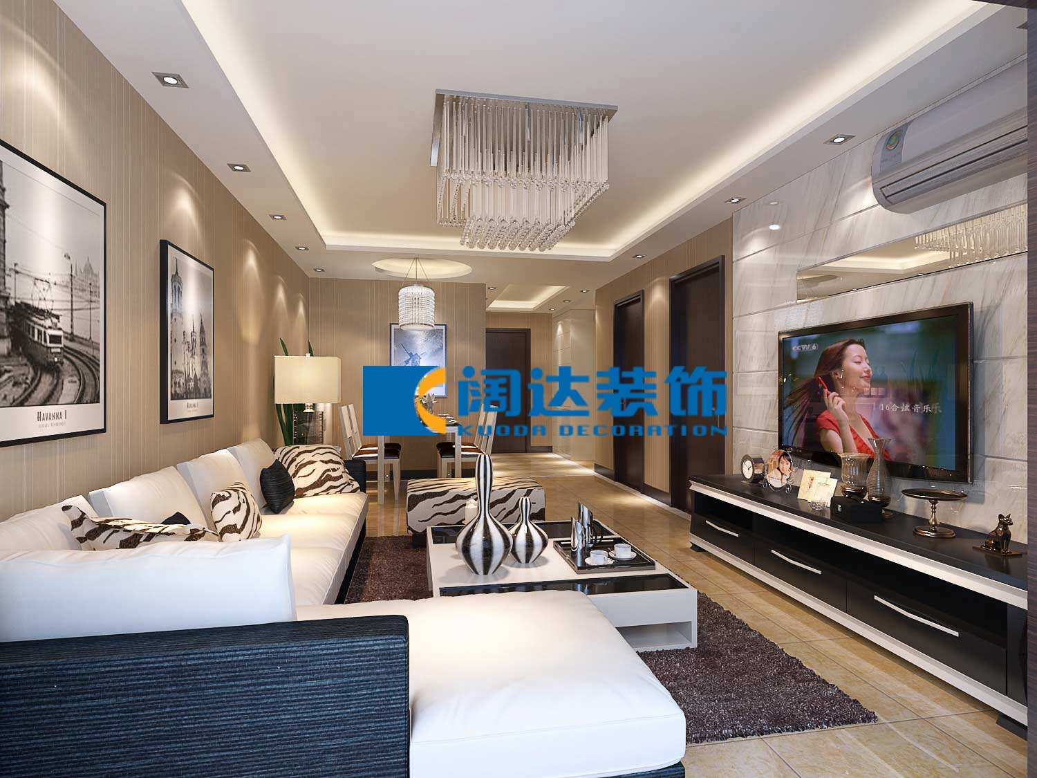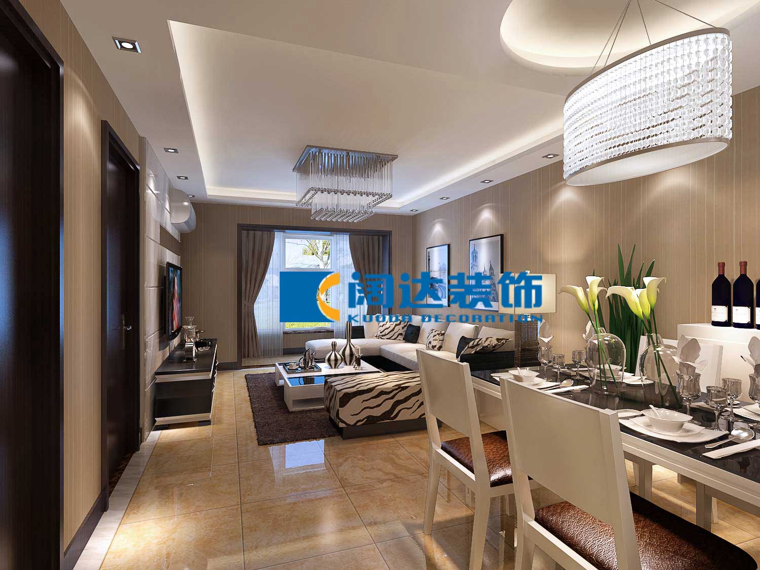 本案戶型設計格局很合理,沒有大的變動,通過造型吊頂和壁紙的相呼應,整體風格統一化,電視背景墻以白色石材為主線貫穿整體,使空間時尚大方。
