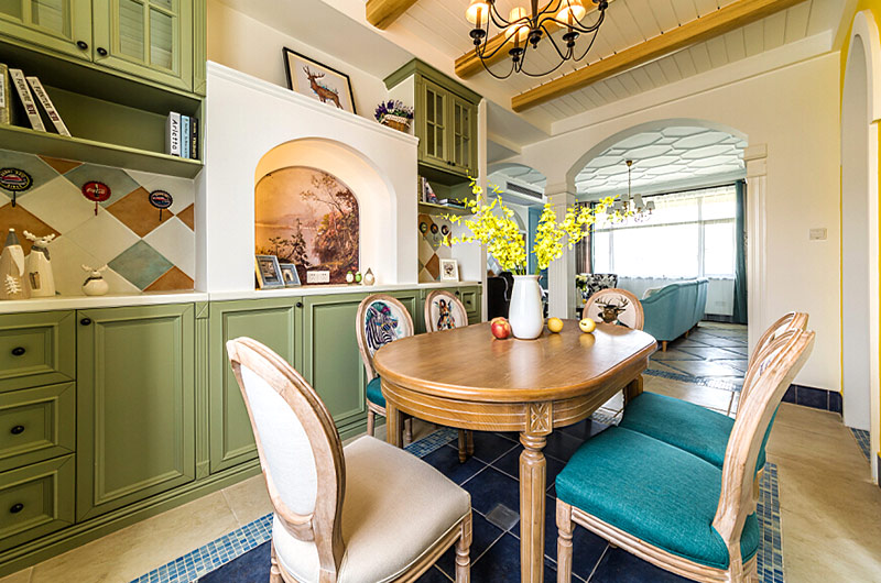 本案中的130平米的三居室整體采用了地中海風格裝修,并在清爽愜意的空間氛圍中融入了田園風格的清新自然感,在色彩的選擇上也盡量的以清爽的藍色和富有活力的明黃色為主,并在餐廳中運用了象征著森林的墨綠色,為空間帶來靜謐之感的同時也增添了幾分自然的氣息。