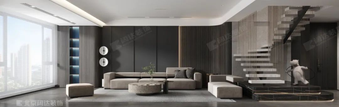 主臥空間的處理趨于簡潔。床頭背景采用了灰色混油面板,使用了柔和的線條燈,除了美感之外,渲染出親切的生活底色。