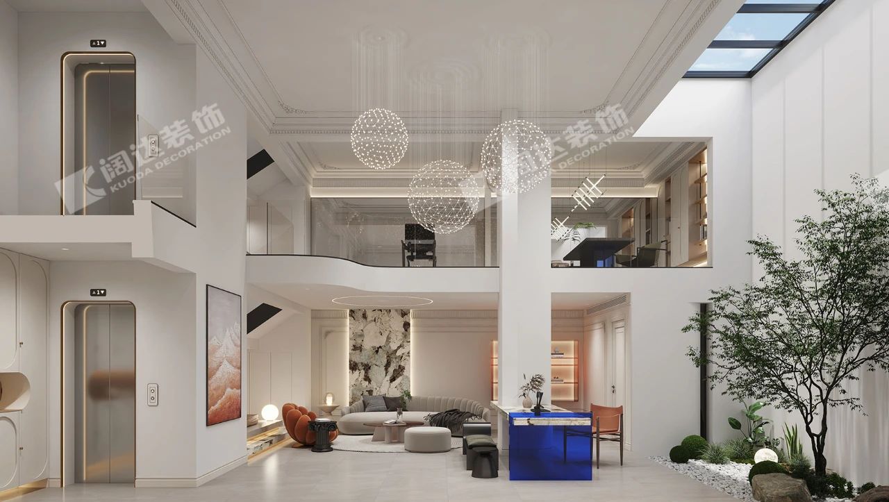 天花上在客廳延續(xù)設(shè)計的同時,加入GRG水波紋定制板,讓天花更具靈動性,弧形元素也與隔層、電梯門、沙發(fā)及衛(wèi)生間的采光窗相呼應(yīng)。