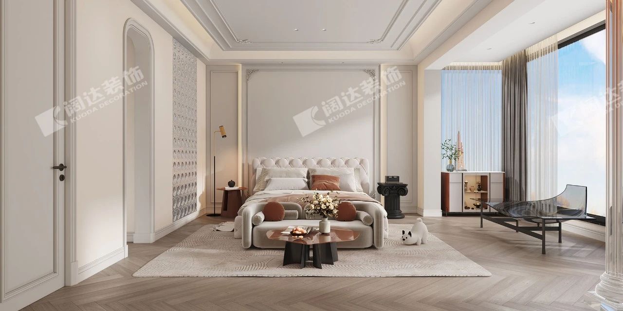 主臥空間渲染著一種靜謐、舒緩的氛圍,讓人身心格外放松舒適,亞力克羅馬柱的運(yùn)用,也是整個空間的一個點睛之筆。