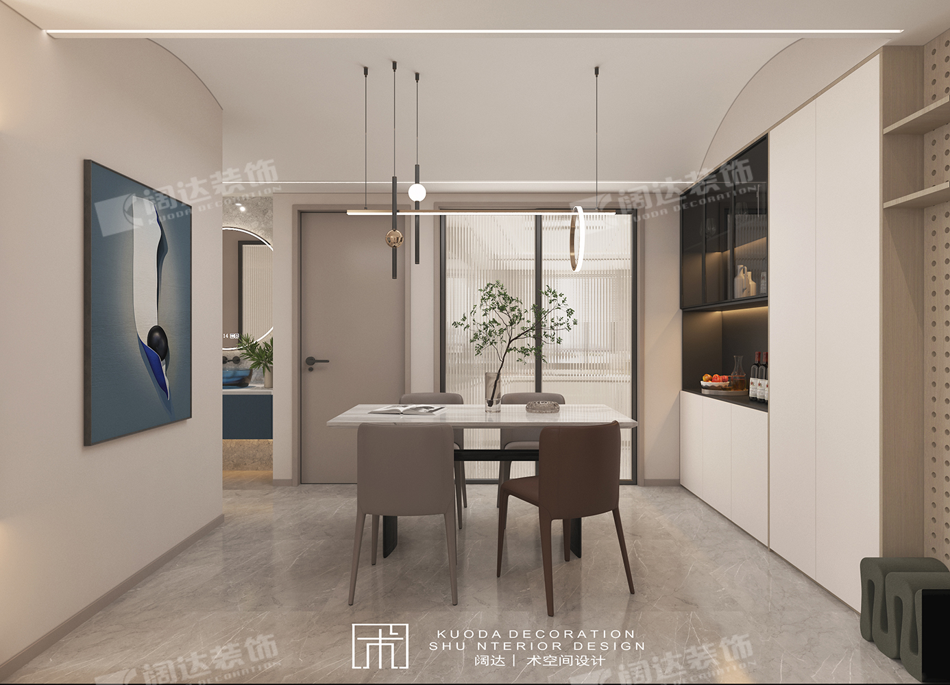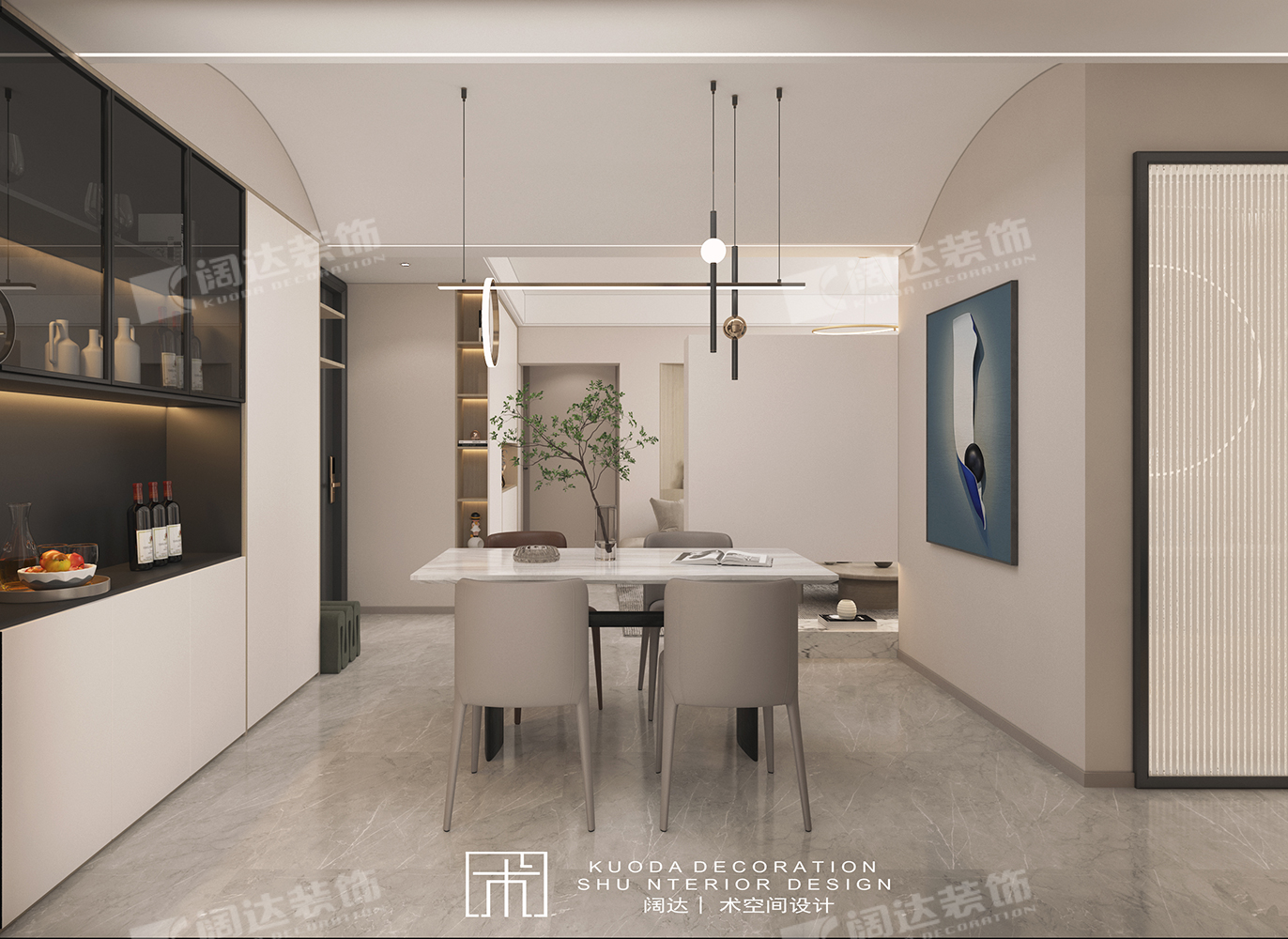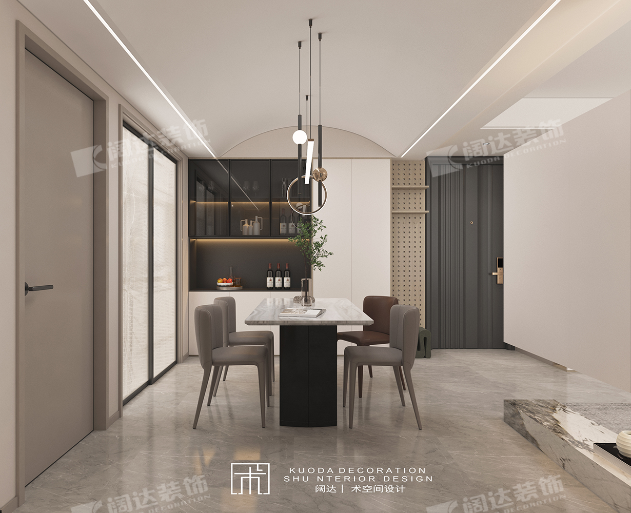 綜合以上調(diào)整結(jié)合業(yè)主需求,設(shè)計(jì)師又將陽(yáng)臺(tái)墻體拆除換成移門(mén),整體基調(diào)簡(jiǎn)約為主,餐廳采用弧形頂設(shè)計(jì),輔以線性燈照明,既適當(dāng)放大層高,又烘托了就餐氛圍。
