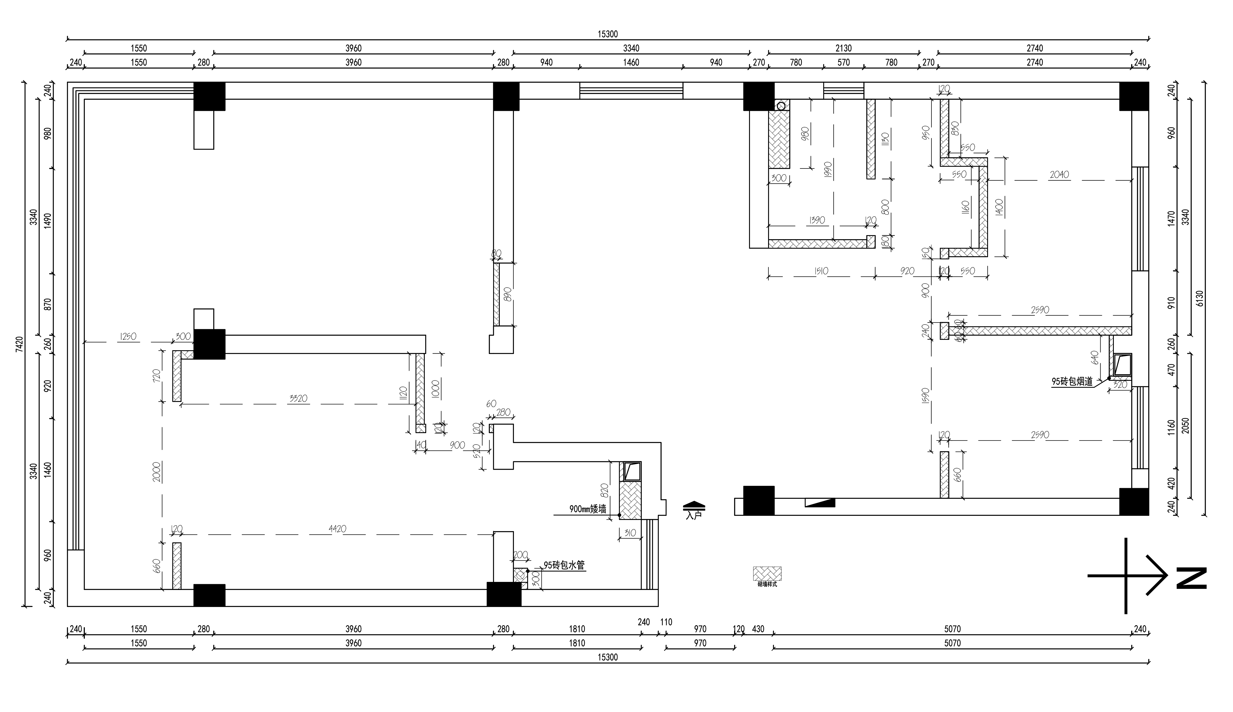 3、將北側(cè)臥室與廚房的墻,整體向內(nèi)移動(dòng),與擴(kuò)大后衛(wèi)生間門(mén)墻對(duì)齊