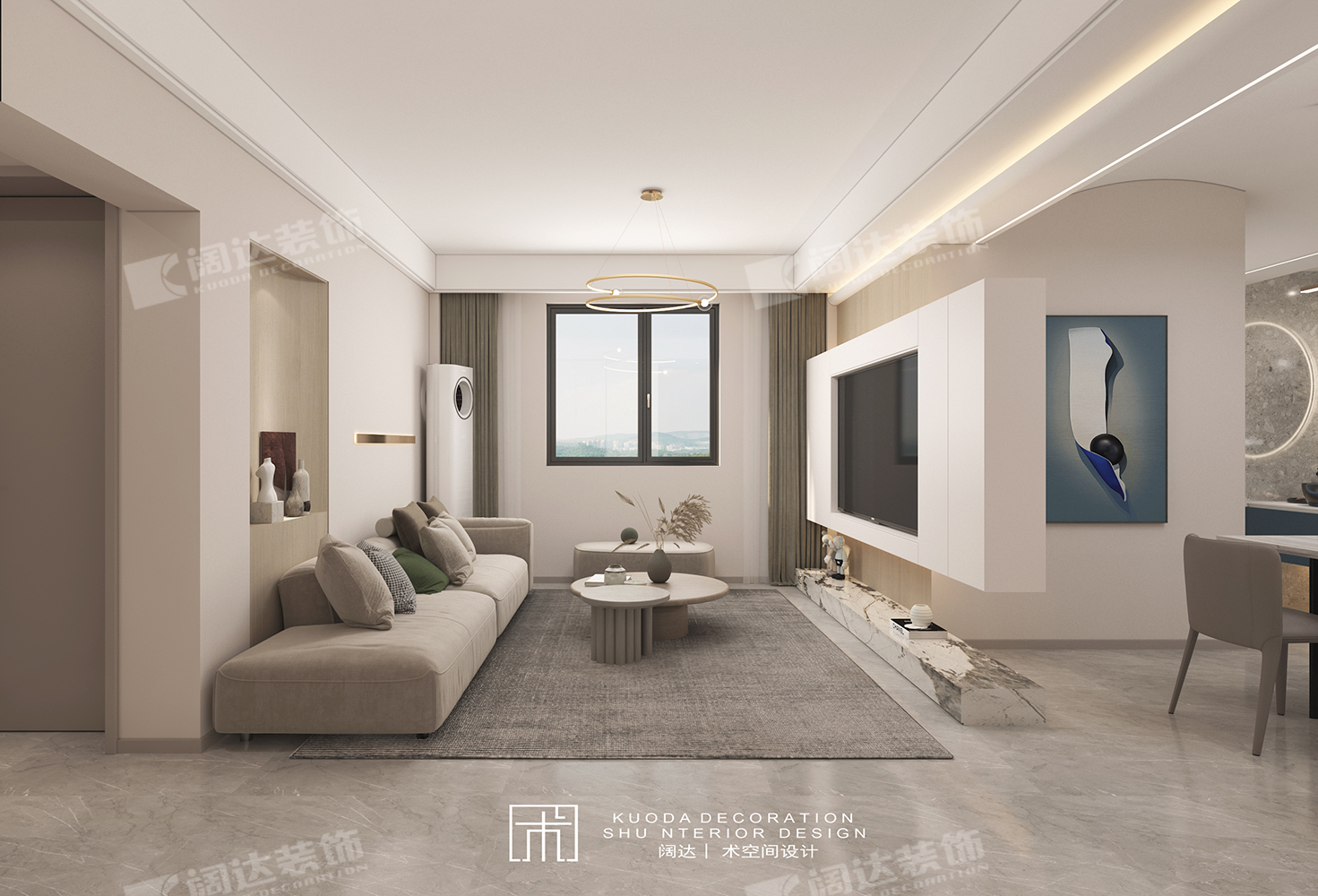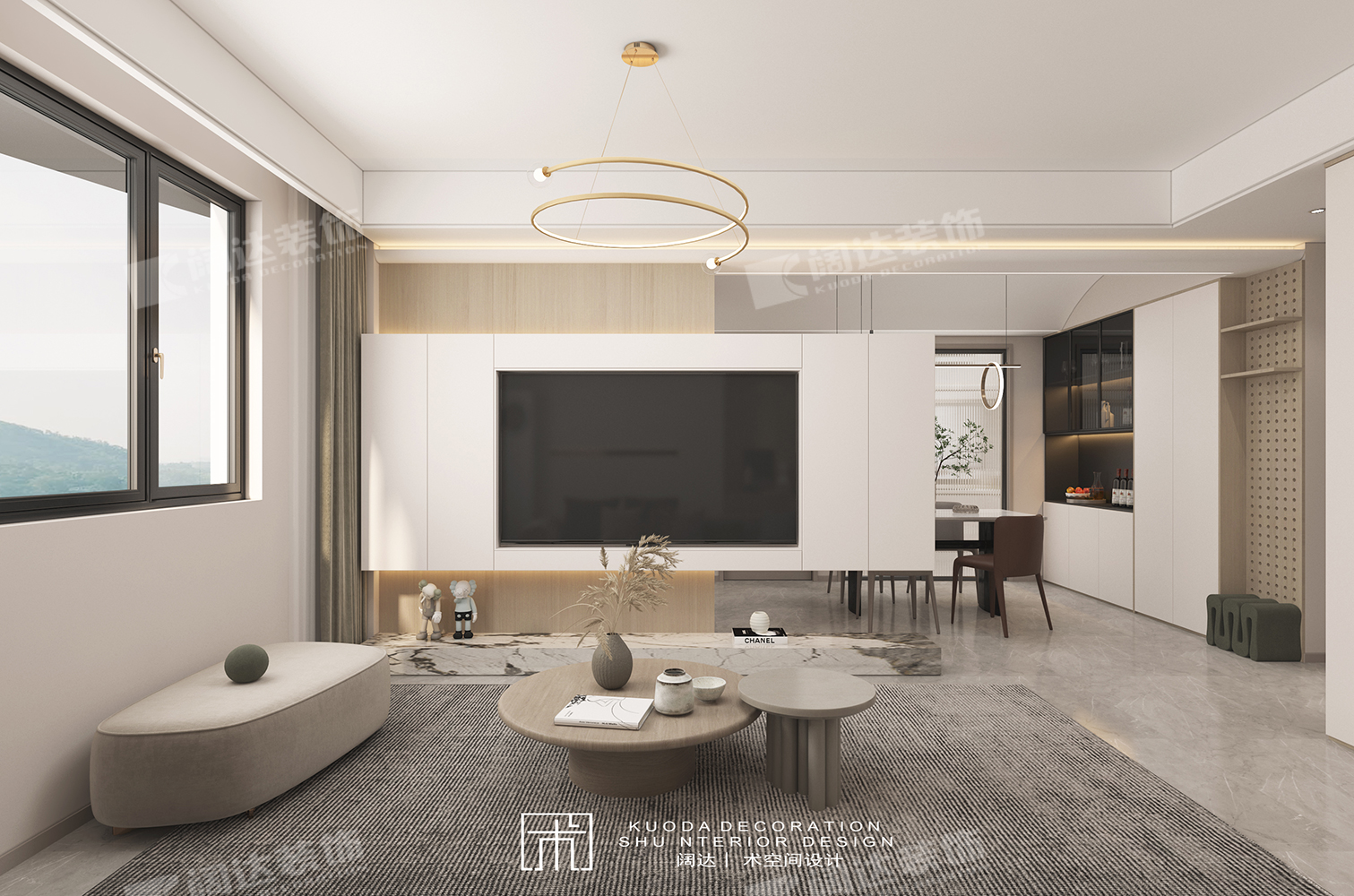 通過(guò)改變臥室門(mén)方向,延長(zhǎng)了客廳墻面,正好將沙發(fā)由南朝北放置于此,對(duì)面電視背景做懸空處理,將光線引入餐廳,整個(gè)區(qū)域采光、動(dòng)線和比例較為適宜。