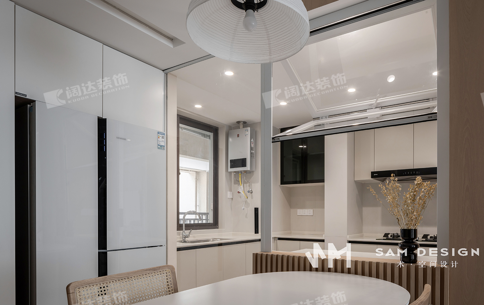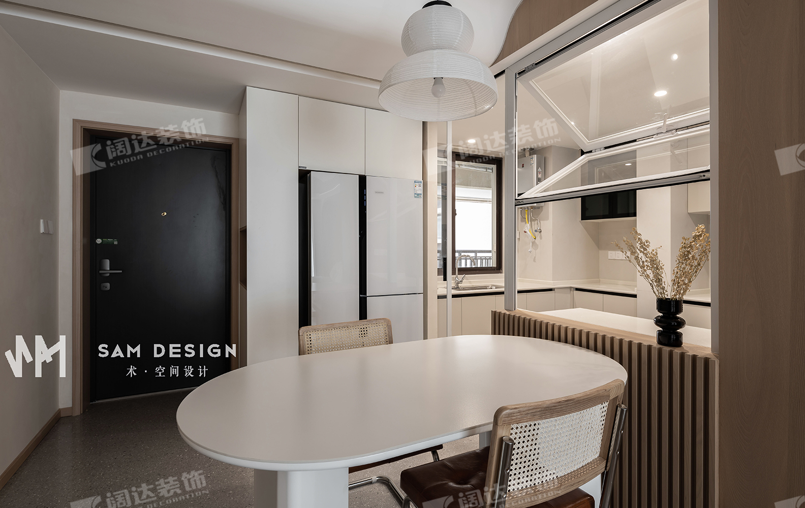 為了增大視覺以及活動(dòng)空間,將餐廳的視角與西廚連為一體,中島式的設(shè)計(jì)在餐廳增加了社交趣味的同時(shí),還增加了餐廳的儲(chǔ)物收納。