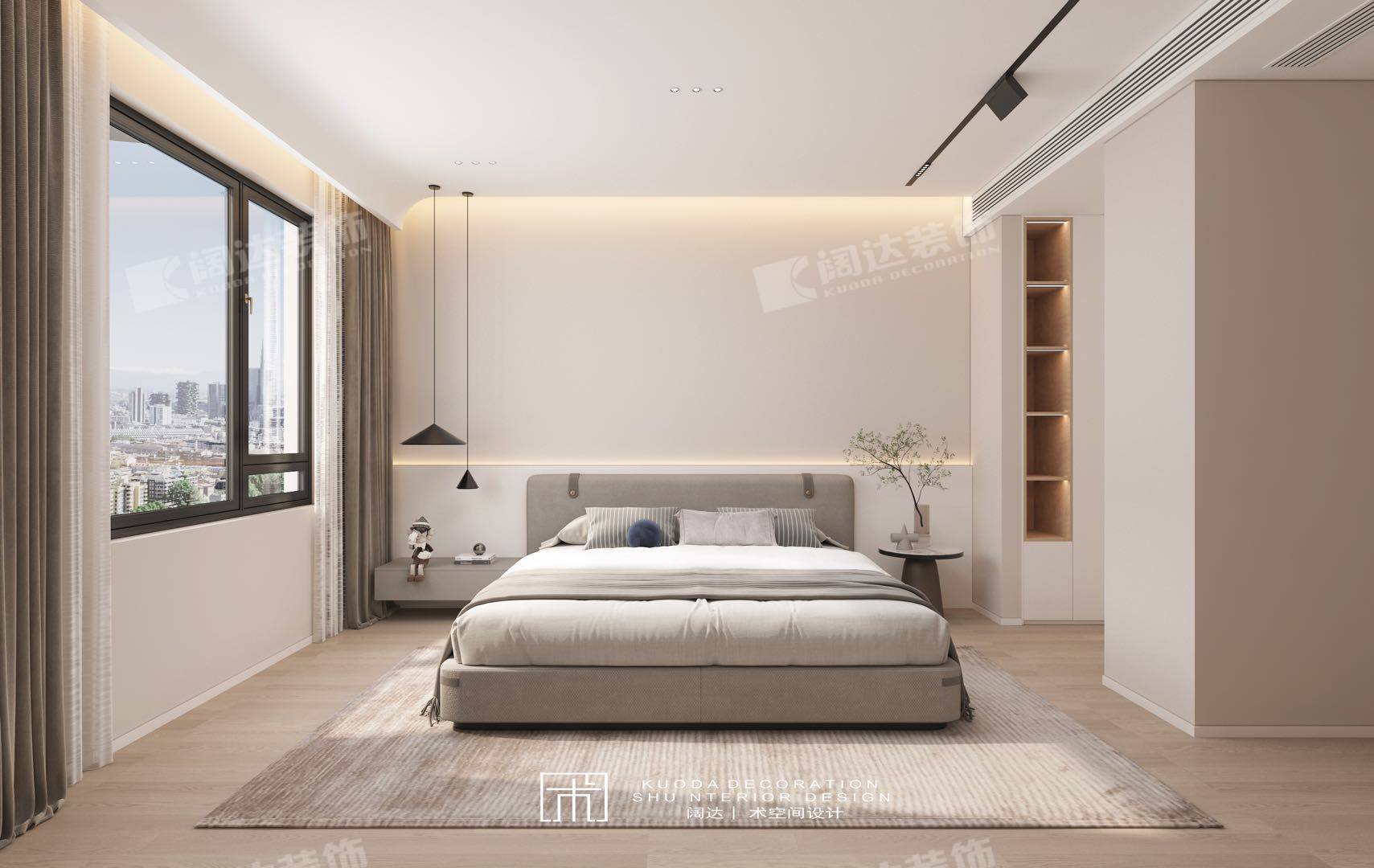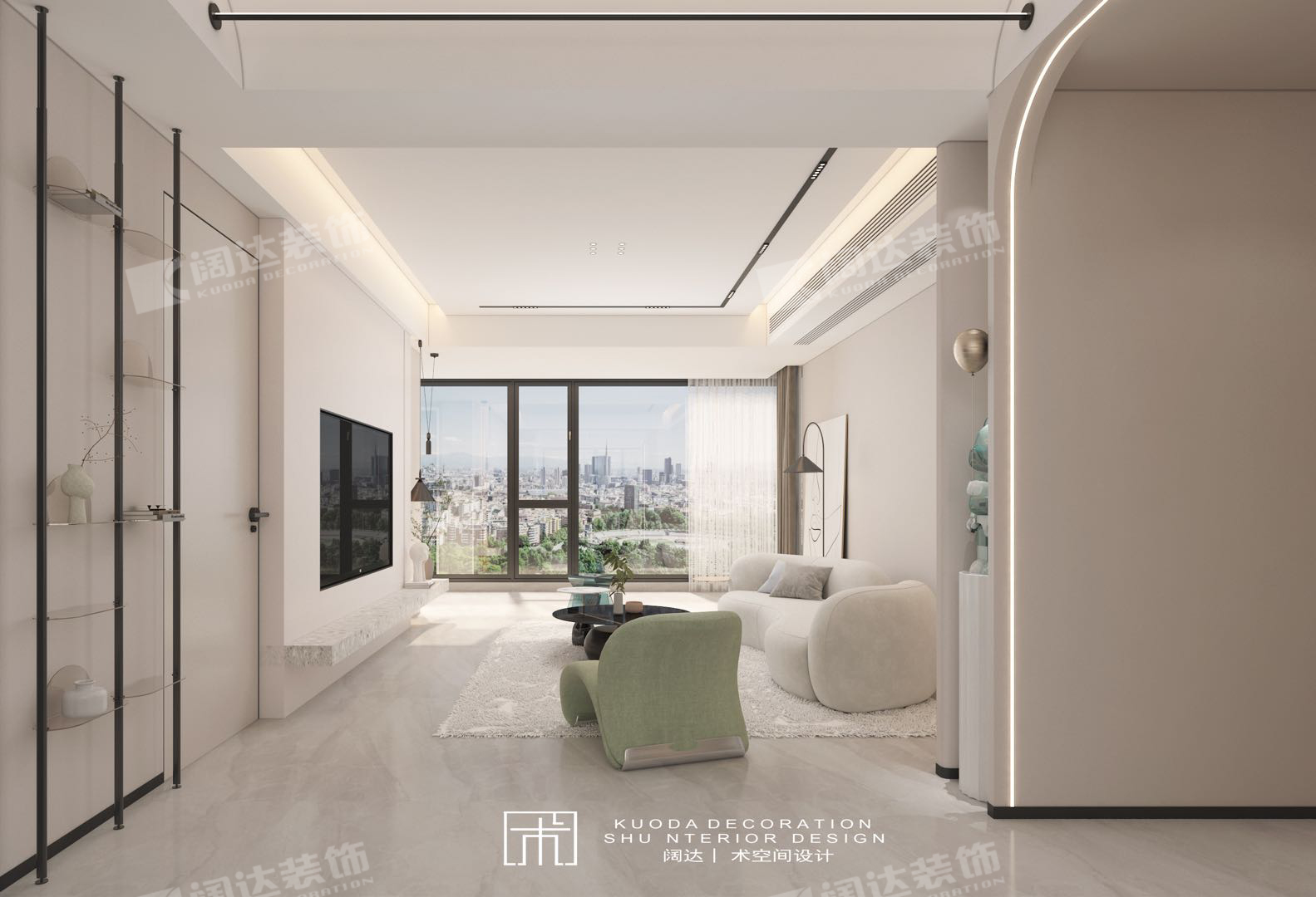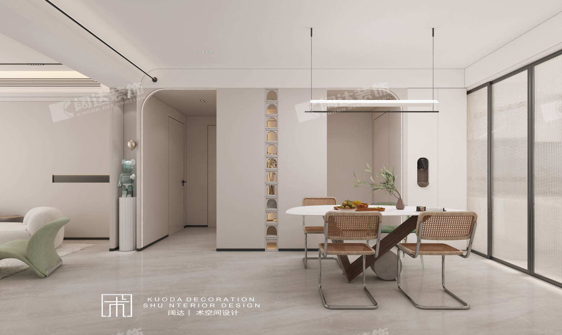 以淡奶油色為基調,大量的圓弧曲線在室內以不同的方式進行呈現,既隔斷了空間,處理了頂上的大梁,又能在造型上展現不一樣的美。搭配簡單的線條畫,給人簡單高級的感覺。