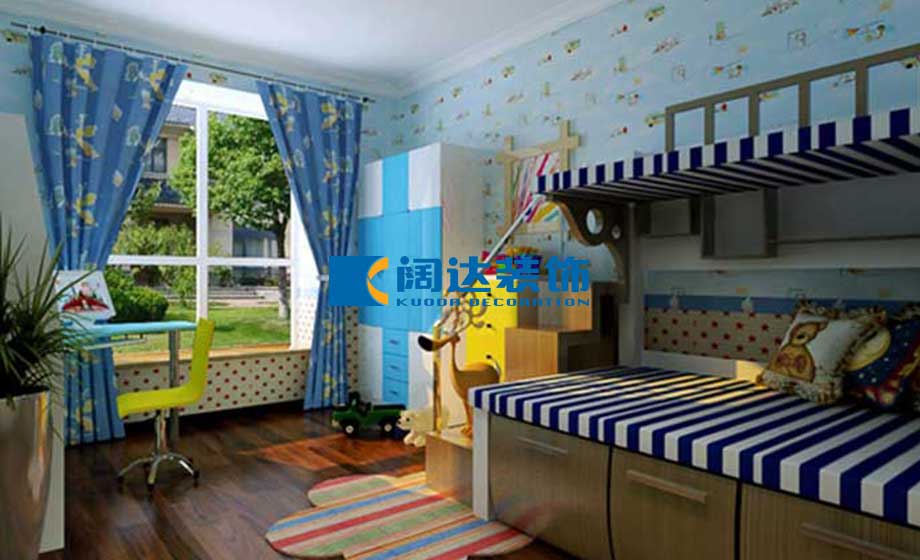 兒童房:以天藍(lán)色的整體色調(diào)和實(shí)木家具的搭配,給孩子營造出健康陽光的休閑和學(xué)習(xí)空間。