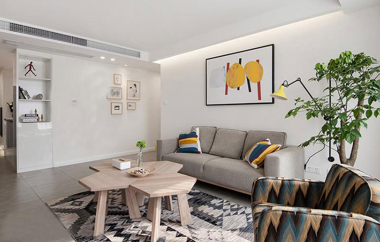 本案戶型設計格局很合理,沒有大的變動,通過造型吊頂和壁紙的相呼應,整體風格統一化,使用了宜家風格,電視背景墻以白色石材為主線貫穿整體,使空間時尚大方。
