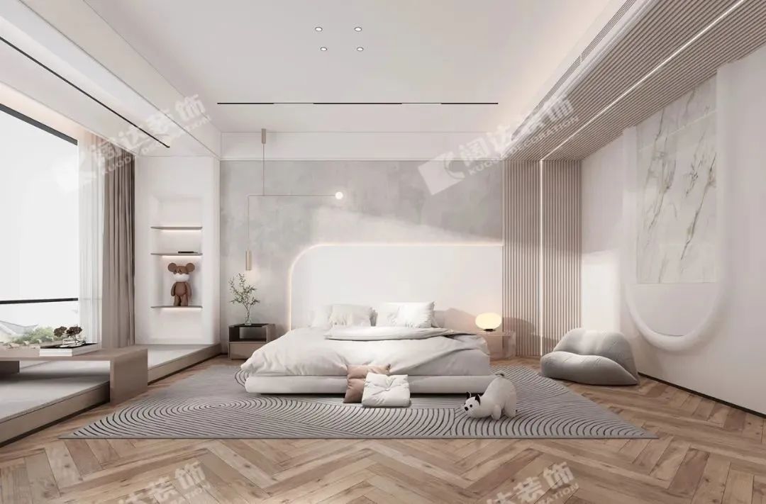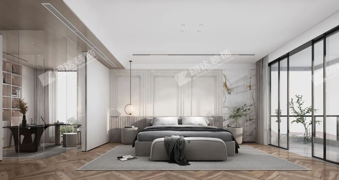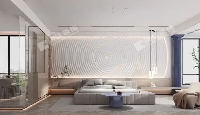 主臥整體空間由低飽和度的顏色組成,背景墻的軟包柔軟細膩,予人冷靜安謐的視覺感受。