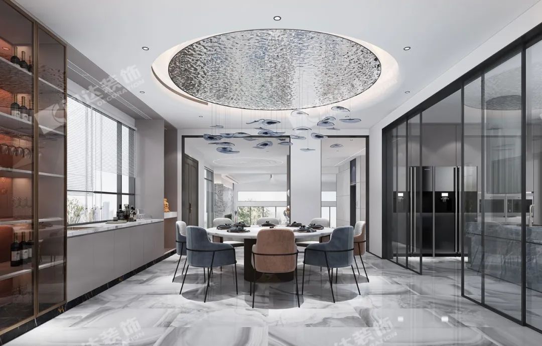 淺色系的餐廳搭配深色系的家具軟裝,金屬吊頂和水晶燈的搭配,整個餐廳給人一種優雅、輕奢的感覺。