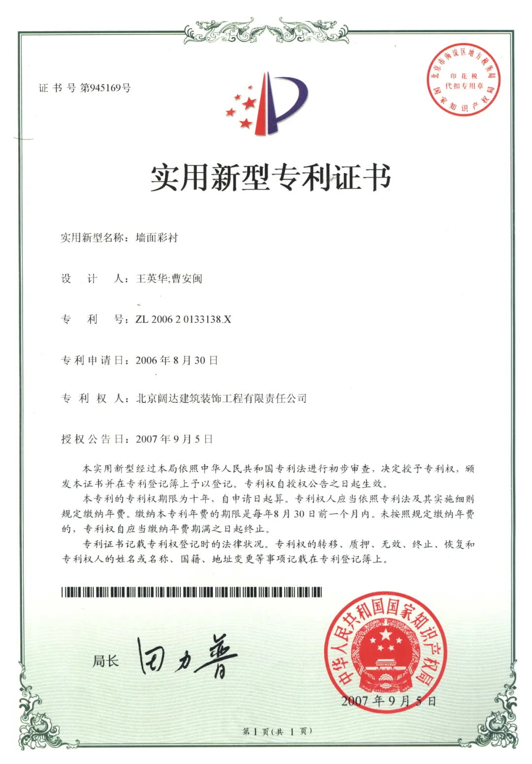 闊達(dá)墻面彩襯可是擁有中華人民共和國(guó)知識(shí)產(chǎn)權(quán)局頒發(fā)的實(shí)用新型專利證書的產(chǎn)品哦。