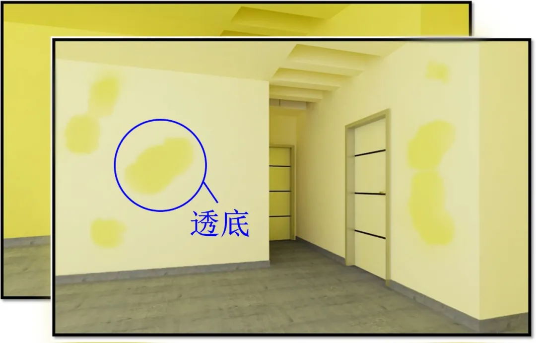 傳統的白色膩子是無法實現對乳膠漆涂刷遍數和涂刷濃度的自檢功能的。而闊達專利技術之一,黃色墻襯恰恰能實現這一功能。因為如果乳膠漆兌水比例超出標準范圍,在乳膠漆涂刷過程中,油工無論涂刷多少遍,這個黃色的墻襯也是遮蓋不住的,乳膠漆干燥后墻面是花的,一團一團的不規則的黃色,也就是俗稱的“透底”(見上圖示例)。