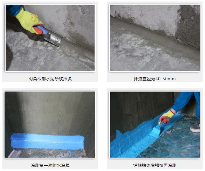 ①在陰角根部,用水泥砂漿進行抹弧處理后再進行防水涂刷。第一次涂刷防水涂層后,必須鋪貼胎體增強布,然后才可以進行二次涂刷。這樣增加了防水涂層的致密性,提高了防水的使用年限。(下圖為操作示意圖)