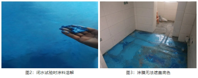 1、涂刷時要檢查基層是否存在起砂、疏松或大量的浮土、浮灰等現象,這些現象會導致防水層與基層的結合不穩定,從而在閉水實驗時容易引起防水層起鼓,涂膜與基層分離的現象(如圖1)。針對現場基層起砂、不牢固的問題,需先對基層涂刷界面劑或墻固,增強墻體基層的附著力,然后再涂刷防水涂料。